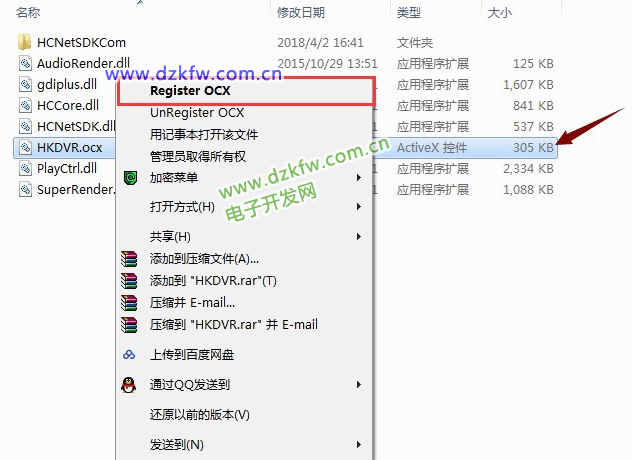 打開(kāi)控件文件,找到HKDVR.OCX,右擊選擇Register OCX即可完成控件注冊(cè),如下圖所示: