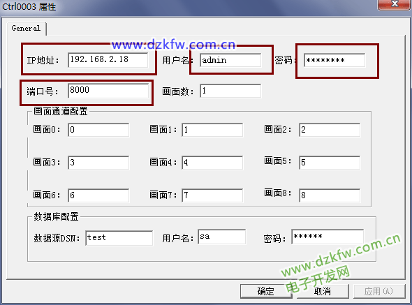 按住鼠標(biāo)左鍵繪制控件大小區(qū)域,右擊選擇控件屬性,彈出控件屬性對(duì)話框,設(shè)置好IP、用戶名、密碼、端口號(hào)即可,如下圖所示: