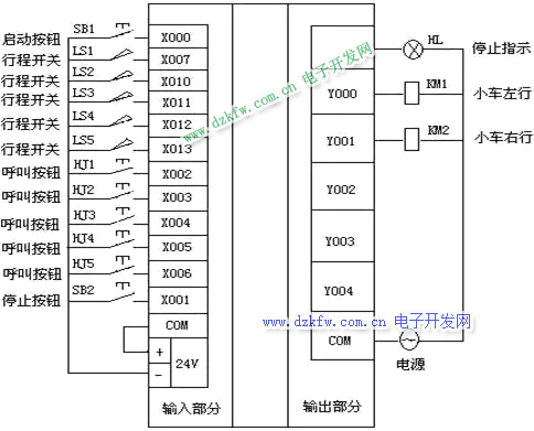根據(jù)運料小車隨機運動控制的要求,可將5個行程開關(guān)賦予不同的值;同時,將5個按鈕也對應(yīng)賦值。當(dāng)小車碰到某個行程開關(guān)時,就將該行程開關(guān)的值送到內(nèi)部輔助繼電器通道。當(dāng)操作者壓了某個按鈕時,就將該按鈕的值送到內(nèi)部輔助繼電器通道。然后將這兩個通道的值進行比較,根據(jù)比較的結(jié)果使小車作相應(yīng)的運動,直到兩個通道的值相等時小車才停止。由此可得到如圖5-1 所示的運料小車隨機運動控制PLC外部接線圖: