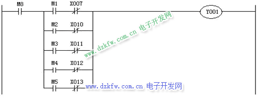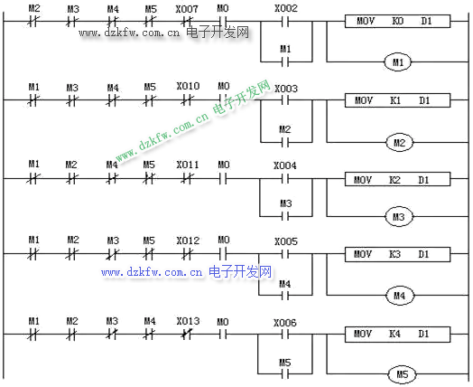 在該程序中,5個站的行程開關(guān)分別用數(shù)字0-4 來表示,當(dāng)小車在1號站時,行程開關(guān)X007得電,將數(shù)字0傳送到數(shù)據(jù)寄存器D0;當(dāng)小車在2號站時,行程開關(guān)X010得電,將數(shù)字1傳送到數(shù)據(jù)寄存器D0。依次類推,當(dāng)小車在5號站時,行程開關(guān)X007得電,將數(shù)字4傳送到數(shù)據(jù)寄存器D0。它所對應(yīng)的梯形圖如圖6-1所示: