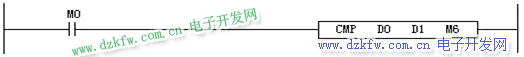 按下啟動按鈕和呼叫按鈕后,開始對行程開關(guān)數(shù)據(jù)寄存器D0和呼叫按鈕數(shù)據(jù)寄存器D1中的數(shù)據(jù)進行比較。當(dāng)(D0)>(D1)時,即小車當(dāng)前所處停靠站的編碼大于呼叫按鈕的編碼時,M6得電,小車向左運行;當(dāng)(D0)=(D1)時,即小車當(dāng)前所處停靠站的編碼等于呼叫按鈕的編碼時,M7得電,小車停止不動;當(dāng)(D0)<(D1)時,即小車當(dāng)前所處停靠站的編碼小于呼叫按鈕的編碼時,M8得電,小車向右運行。它所對應(yīng)的梯形圖如圖6-4所示: