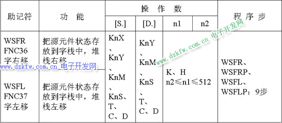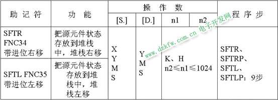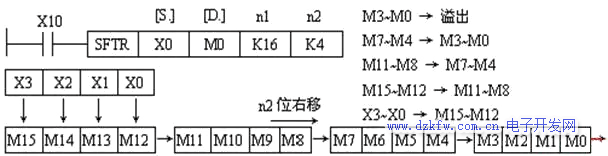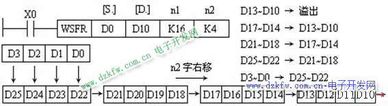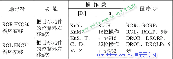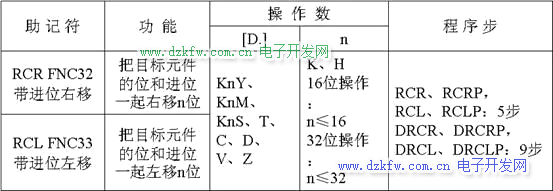 執(zhí)行RCR、RCL指令時(shí),各位的數(shù)據(jù)與進(jìn)位位M8022一起(16位指令時(shí)一共17位)向右(或向左)循環(huán)移動n位。在循環(huán)中移出的位送入進(jìn)位標(biāo)志,后者又被送回到目標(biāo)操作元件的另一端。