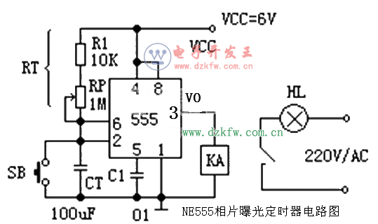 電源接通后,定時器進入穩態。此時定時電容CT的電壓為:VCT=VCC=6V。對555這個等效觸發器來講,兩個輸入都是高電平,即VS=0。繼電器KA不吸合,常開點是打開的,曝光照明燈HL不亮。按一下按鈕開關SB之后,定時電容CT立即放到電壓為零。于是此時555電路等效觸發的輸入成為:R=0、S=0,它的輸出就成高電平:V0=1。繼電器KA吸動,常開接點閉合,曝光照明燈點亮。按鈕開關按一下后立即放開,于是電源電壓就通過RT向電容CT充電,暫穩態開始。當電容CT上的電壓升到2/3VCC既4伏時,定時時間已到,555等效電路觸發器的輸入為:R=1、S=1,于是輸出又翻轉成低電平:V0=0。繼電器KA釋放,曝光燈HL熄滅。暫穩態結束,恢復到穩態。