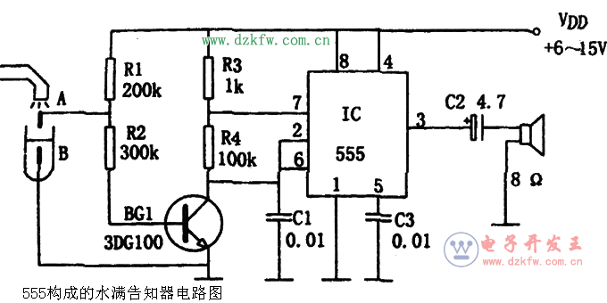 當(dāng)水滿時(shí),A、B間呈短路狀態(tài),使BG1截止,觸發(fā)振蕩電路起振,其③腳輸出的振蕩信號(hào)驅(qū)動(dòng)揚(yáng)聲器Y發(fā)出音響,以告知主人水滿。