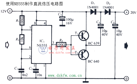 該電路可以提升直流電壓,電路簡單實用。IC1(NE555)連接成一個多諧振蕩器,振蕩頻率約為8.5KHZ,輸出的方波信號驅動T1、T2.。D1、C3、D2和C4組成倍壓整流電路,C4兩端的電壓接近于T1、T2輸出方波電壓幅度的2倍,本電路中約為20V。電路的最大輸出電流不超過70mA,當輸出電流70mA時的輸出電壓是18V,這時轉換效率為32%。如果對電壓輸出要求高,輸出端可連接78LXX系統穩壓IC。