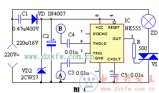 該裝置電路見圖1。當(dāng)人手碰一下金屬觸片A,人體上的雜波信號便通過C3加到時(shí)基電路的②腳,②腳被觸發(fā),整個(gè)觸發(fā)器翻轉(zhuǎn),③腳輸出高電平,輸出經(jīng)限流電阻R加到可控硅控制極,可控硅VS導(dǎo)通,ZD點(diǎn)亮。
