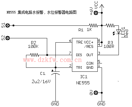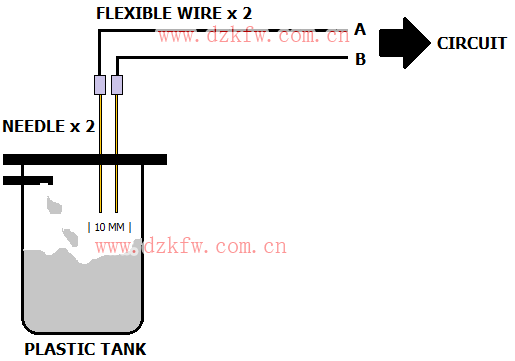 該電路可以連接閃光LED當水包含在一個塑料罐已達到預期的水平。它應該由兩個小針裝置安裝在頂部的塑料罐,也充當傳感器探頭。如果一個更深的感知水平是必要的,針可以由兩片柔性線擴展。