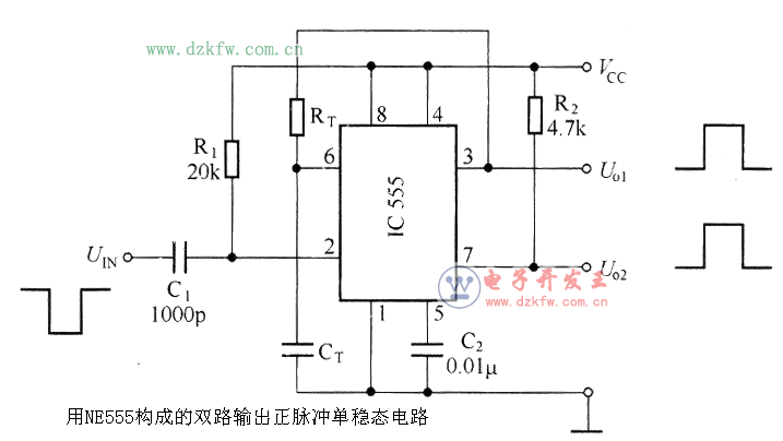 雙路輸出正脈沖的單穩態電路如下圖所示。在該電路中,將內部放電開關電路也作為一路輸出,形成兩個輸出端,可產生暫穩態脈寬 的正脈沖。電路恢復到穩態時,電容CT不再通過內部電路放電,而是由RT放電,因此恢復時間等于暫穩態脈寬。