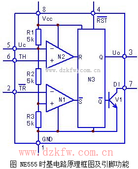 NE555時基電路,為電壓比較器和R-S基本觸發器的混成電路,可方便地構成單穩態(延時、定時)電路、雙穩態(開關)電路及無穩態(振蕩)電路。其構成電路之簡便和應用之廣,素有“萬能電路”之稱。