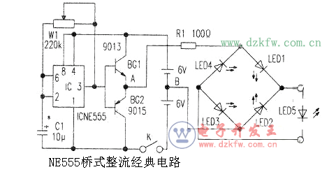 IC接成自激多諧振蕩電路,其振蕩頻率由C1和W4控制。IC③腳輸出的振蕩信號控制BG1和BG2輪流導通,這樣A點的電位相對于B點而言,就成了高低相間的交流電。當lC③腳輸出低電平時,BG2導通,BG1截止,這樣A點為低電平,B點為高電平,電流就通過B→LED2→LED5→LED4→A流動。此時,LED2、LED5、LED4均發光。當IC③腳輸出高電位時,BG1導通,BG2截止,A點為高電位,B點為低電位。此時電流經A→LEDI→LED5→LED3→B流動,LED1、LED5、LED3均發光,這樣整個電路就模擬完成橋式整流過程。在電路中LED5用來演示橋式整流電路輸出端的正負極性。