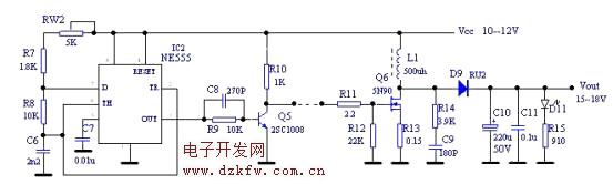 通過調節RW2,可以改變NE555的振蕩周期,同時也改變了輸出波形的占空比,從而改變L1的儲能大小,最終改變了輸出電壓值。