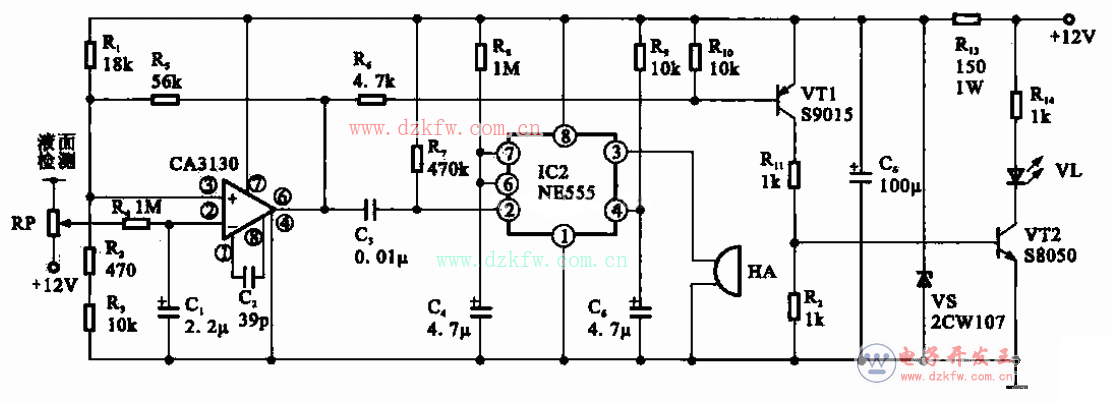 汽車油量檢測報警電路:電路工作原理,通過可調電阻RP阻值(這個是油箱里面的浮動裝置)的大小變化,再經過差動放大器CA3130進行放大,最后NE555時基電路進行處理輸出到報警器。