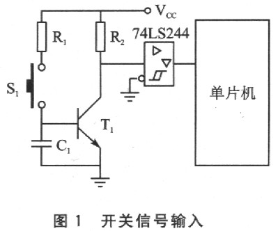 一般輸入信號最終會以開關(guān)形式輸入到單片機(jī)中,以工程經(jīng)驗來看,開關(guān)輸入的控制指令有效狀態(tài)采用低電平比采用高電平效果要好得多,如圖1如示。當(dāng)按下開關(guān)Sl時,發(fā)出的指令信號為低電平,而平時不按下開關(guān)S1時,輸出到單片機(jī)上的電平則為高電平。該方式具有較強(qiáng)的耐噪聲能力。