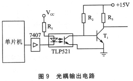 光電耦合可以傳輸線性信號,也可以傳輸開關(guān)信號,在輸出級應(yīng)用時主要用來傳遞開關(guān)信號。如圖9所示,單片機(jī)輸出控制信號經(jīng)緩沖器7407放大后送入光耦。R2為光耦輸出晶體管的負(fù)載電阻,它的選取應(yīng)保證:在光耦導(dǎo)通時,其輸出晶體管可靠飽和;而在光耦截止時,Tl可靠飽和。但由于光耦響應(yīng)速度慢使開關(guān)延遲時間加長,限制了其使用頻率。
