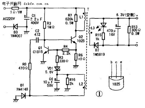 圖1中,VD1、Q1等元件組成穩(wěn)壓電壓。若輸出電壓過高,則L2繞組的感應電壓也將升高,D1整流、C4濾波所得電壓升高。由于VD1兩端始終保持5.6V的穩(wěn)壓值,則Q1 b極電壓升高,Q1導通程序加深,即對Q2 b極電流的分流作用增強,Q2提前截止,輸出電壓下降 若輸出電壓降低,其穩(wěn)壓控制過程與上述相反。