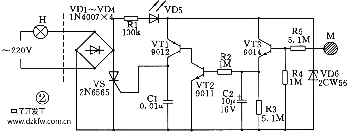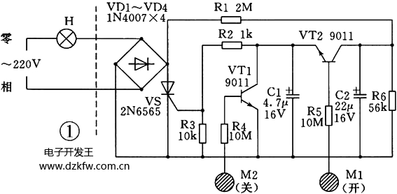 平時晶閘管VS關斷,電燈H不亮,220V交流電經VD1~VD4橋式整流,R1、R2分壓,在C2兩端儲存8V左右的直流電壓。當人手觸摸電極片M1時,人體泄漏電流經高值電阻R5注入VT2的基極,使VT2迅速導通,C2儲存電荷經VT2向C1充電,并經R2為VS提供正向觸發電流,VS開通,燈H點亮發光。VS開通后,由于R2取值較小,VS門極的漏電流可經R2向C1充電,所以人手離開M1后,雖然VT2恢復截止,但C1兩端電壓不會跌落,所以VS仍能保持導通態,H仍點亮發光。此時220V交流電壓主要降落在H兩端,VS兩端電壓僅幾伏,由于VS采用微觸發單向晶閘管2N6565(最大通態電流為0.8A,最高反向耐壓為400V),所以VS仍能維持工作(下面三個電路均是如此)。