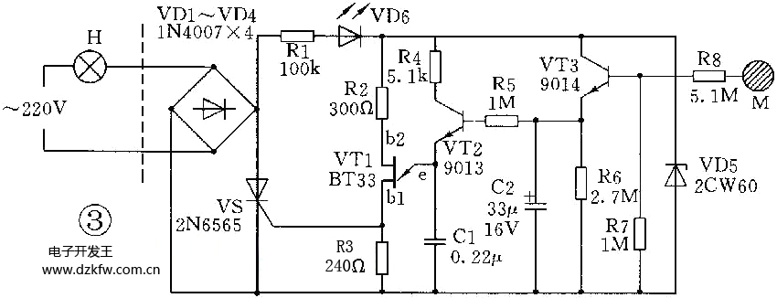 發光二極管VD5在電燈H未點亮時可發微光指示開關的位置,方便在夜間尋找開關。平時VT3的集電極被VD6鉗位在8V左右,VT1~VT3均處于截止態,VS因無觸發電壓處于關斷態,故電燈H不亮。需要開燈時,只要用手指摸一下電極片M,因人體泄漏電流經R5與R4分壓后注入三極管VT3的基極,使VT3迅速導通,8V直流電就經過VT3向C2充電,并經R2使VT2導通,VT1也隨之迅速導通,VS因門極獲得正向觸發電流而開通,燈H即被點亮。人手離開電極片M后,因C2儲存的電荷通過R2向VT2的發射結放電,所以仍能維持VT2、VT1及VS的導通,電燈H依然點亮。直至C2電荷基本放完,VT2由導通轉為截止,VT1也隨之截止,VS因失去觸發電流在交流電過零時即關斷,燈滅。改變R2、R3及C2的數值能調節電燈每次被點亮的時間長短。采用圖示數據,每觸摸一次電極片M,電燈H約能點亮60s。