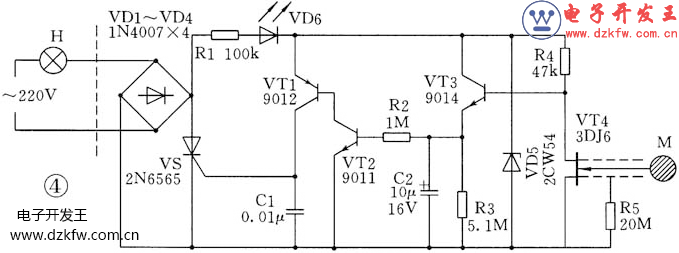 平時VT1~VT3均處于截止狀態,晶閘管VS處于關斷態,電燈H不亮。此時發光二極管VD6點亮發光,指示開關位置。需開燈時,手指靠近電極片M(實際上是隔著塑料面板摸M),人體感應的雜波信號電壓注入場效應管VT4的柵極,使漏源極間電流減小,漏極電位即VT3的基極電位升高,VT3導通,C2即被充電,當VT2因基極電位升高而導通,VT1也隨之導通,VS獲得觸發電流開通,電燈即點亮發光。人手遠離M后,VT4柵極恢復低電平,VT3截止。此時C2貯存電荷將通過R2向VT2發射結放電,維持VT2的導通狀態,電燈仍被點亮。當C2上的電壓降到0.7V以下時,VT2、VT1相繼截止,VS關斷,電燈H就熄滅。
