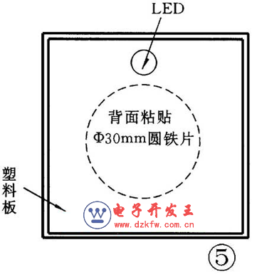 開關面板結構見圖5,可采用86系列開關全塑面板,在上部適當位置開一小圓孔,以便嵌放發光二極管。電極片可用馬口鐵皮剪成Φ30mm的圓片形,用不干膠帶紙將它粘貼在開關面板的背面,然后用屏蔽線連接到VT4的柵極,屏蔽線不宜太長,一般應控制在40mm以內。開關的電路板就固定在面板的背后。本開關的延遲時間主要取決于電阻R2、R3及電容C2的數值,調整其數值可以改變開關的延遲時間。