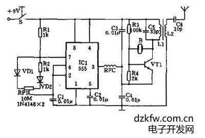 L1可用10K型中周骨架,用Φ0.15高強度漆包線繞9匝,L2在L1的外層用同型號漆包線繞3匝,不用屏蔽罩,但需旋入磁芯。L3同L1制作。B用JAl2等金屬殼諧振器,頻率在27-29.8MHz之間。VT1、VT2、VT3均用3DG130D型NPN三極管,β>100。VT4選用3DD15D型大功率管。RFC用18uH色碼電感。IC1的型號為NE555。IC2的型號為LM386。電容除標明的電解電容外均用CC1型高頻瓷介電容。電阻均用1/8w碳膜電阻器。