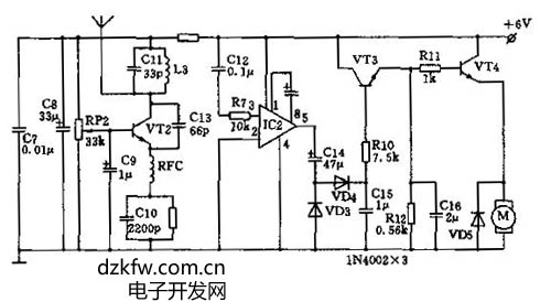 下圖為接收驅動電路。為簡化接收電路,由VT2及其外圍元件構成超再生檢波器,檢出原方波調制信號。由C12、R7加至IC2的③腳進行放大,放大后的信號經VD3、VD4倍壓整流,由VT3射隨器輸出平滑的直流電壓。該電壓的大小與發送的不同占空比信號波形有關,占空比大,電壓高,經R11為VT4提供的偏置電流大,電機的轉速高;占空比小,電壓低,經R11為VT4提供的偏置電流小,電機轉速慢。當占空比足夠小時,VT3截止無輸出,VT4因失去偏置而不導通,電機M停轉。由此可得電機轉速與占空比成正比關系。