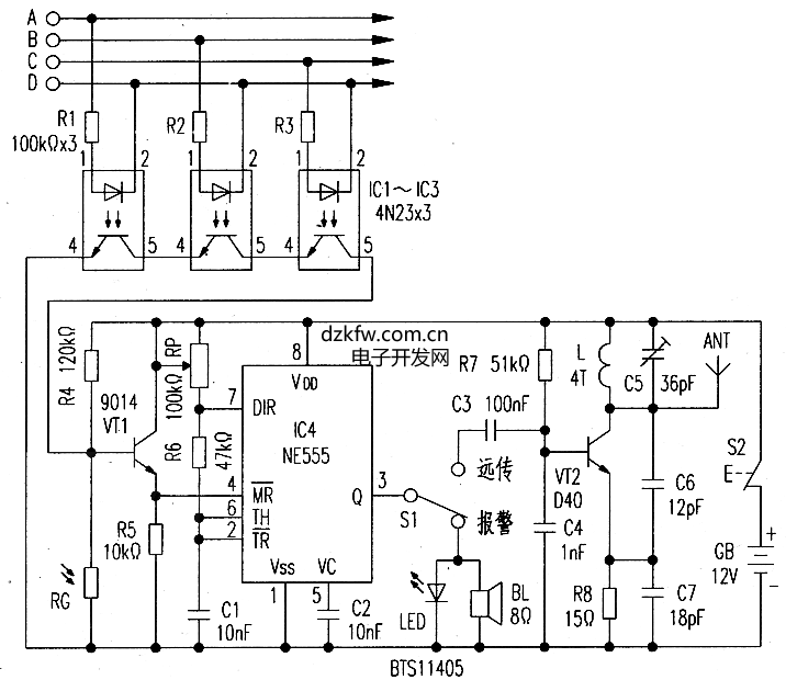 電路原理如圖1所示。Rl~R3和光耦合器IC1~IC3(4N23)作隔離取樣。光敏電阻RG的亮阻應小于100Ω暗阻大于10MΩ.其作用是白天受光照阻值很小,報警電路不工作.晚上電阻大,可進行報警。如果需要白天和晚上都處于警戒狀態.可去掉RG不用。IC4(NE555)接成無穩態振蕩器模式.調節RP可獲得750~1500Hz報警頻率(按f=1.443/(RP+2R6)·C1估算)。S1為現場報警或無線遠傳報警選擇開關.BL為8Ω/0.5W揚聲器,LED使用紅色頻閃發光二極管。VT2等組成調頻載波振蕩發射電路,L1、C5并聯諧振頻率即為發射頻率,報警信號由1km以外的調頻收音機接收。