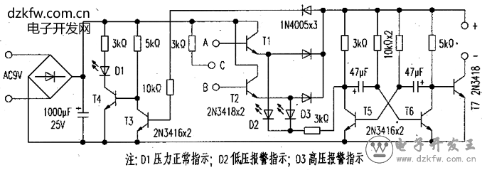 目前醫(yī)院所用的氣動設備,所需壓力均在0.3MPa~0.5MPa之間.可將監(jiān)測器的電接點壓力表的低壓報警電極A,調至表的刻度盤上0.28MPa處。將高壓報警電極B,調到0.52MPa處。然后將電接點表的三個電極,分別與電路圖中的A、B、C三個電極對應接好。接通9V的交流電源,經整流、濾波后形成一個+12v電源,作為報警電路的工作電源。如果供氣設備輸出的壓力正常,則監(jiān)測器用的電接點壓力表的示值指示電極C,始終保持在0.3MPa~1.5MPa之間,不與A、B任何一個電極接觸.晶體管T1、T2由于基極為零電位,均為截止狀態(tài),其發(fā)射極為零電位.報警部分由于無工作電源而不工作。同時.由于T3的基極也是零電位,其集電極的正電位使T4導通。壓力正常指示燈D1亮。