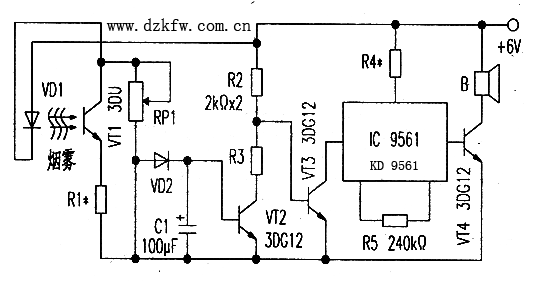 煙霧報警器由紅外發光管、光敏三極管、KD9561構成,電路如附圖所示。當被監視的環境潔凈無煙霧時.紅外發光二極管VD1以預先調好的起始電流發光。該紅外光被光敏三極管VT1接收后其內阻減小.使得VD1和VT1串聯電路中的電流增大,紅外發光二極管VD1的發光強度相應增大,光敏三極管內阻進一步減小。如此循環便形成了強烈的正反饋過程,直至使串聯感光電路中的電流達到最大值,在R1上產生的壓降經VD2使VT2導通,、VT3截止.報警電路不工作。
