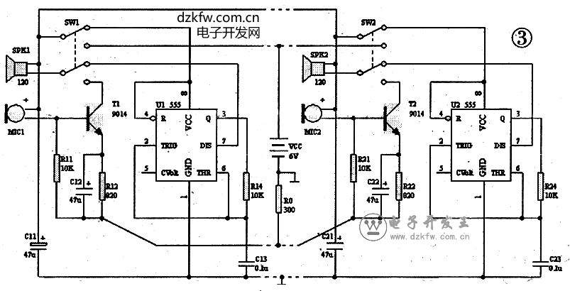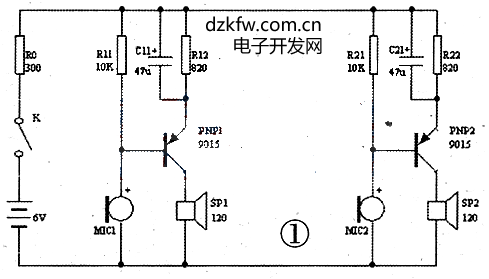 話筒MIC的語音信號引起本端9015三極管的電流變化,在Ro(300Ω)電阻上產生電壓變化信號.一部分電壓變化信號進入另一端的三極管發射結進行放大,在耳機上產生聲音輸出。由于輸出功率不大,耳機與話筒之間有一定距離(對于一般的電話手柄,此距離大于12cm),傳向話筒的回饋很小,不會引起嘯叫,實際使用也無任何不適,所以不用消側音電路。本電路無振鈴,開關K閉合即可進行雙方通話,語音清晰,噪音非常小。電源電流為2.2mA~7mA.平均電流只有4.5mA,極為省電。電源電壓在4V~10V范圍內均可正常工作(電壓過高可能會燒掉MIC)。經實測,兩對講分機間的距離長達300m時仍可正常通話。如果再并聯一組分機電路.可實現三方通話。