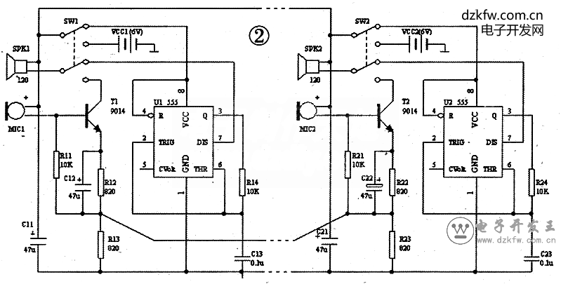 1.兩分機都掛機時.電源VCC處于斷開狀態,整個裝置不耗電。2.若左側分機摘機,插簧抬起.左側的電源通過導線向右側供電,右側的555振蕩電路工作,SPK2發出振鈴音,其頻率為1/(1.4×R24×C23)=1/(1.4×10kΩ×0.1u)=714Hz。同時,左側也能聽到較小的振鈴音。3.若右側也摘機.插簧抬起.兩側的555都斷開電源,兩側電源并聯向通話電路供電,形成與圖1相似的對講電路,可進行雙方通話。4若一側掛機,本側插簧壓下.本側555電路工作.耳機發出振鈴音。當另一側也掛機時.回到1狀態.工作過程結束。