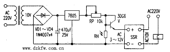 工作原理在附圖中,變壓器次級輸出10V電壓經整流濾波后,途經7805三端穩(wěn)壓器獲得+5V工作電壓。由光敏電阻RH和三極管3DG6及微調電阻RP組成光電開關。白天RH受光照呈低電阻,3DG6處于截止狀態(tài),故固態(tài)繼電器SSR不工作,夜晚RH無較強光線照射呈較高電阻,3DG6獲得合適偏流導通,固態(tài)繼電器工作。