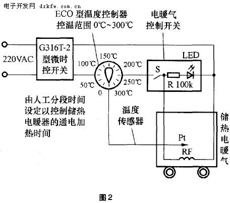 開啟G316T-2型微電腦時控開關,由人工分級時間設定以控制儲熱電暖氣RF的通電加熱時間(如設定當日晚22時至第二日早6時為儲熱電暖氣加熱時間),順時針旋轉ECO溫度控制器轉盤至設定溫度值(如80℃),閉合電暖氣控制開關S,儲熱電暖氣電加熱管RF通電加熱,同時信號指示燈LED點亮。儲熱電暖氣內的輕質耐火保溫磚開始儲存熱量并向外放熱,當儲熱電暖氣內保溫磚的溫度達到溫控器的設定溫度值時,傳感器Pt測得的溫度值轉換成機械能,使溫控器ECO的觸點斷開,電加熱管RF斷電停止加熱,LED熄滅。在G316T-2型微電腦設定的工作時間內處于恒溫工作狀態,當儲熱電暖氣內溫度降低時,ECO溫控器又接通,RF通電加熱,LED點亮⋯⋯ 。如此反復,使RF處于恒溫狀態。