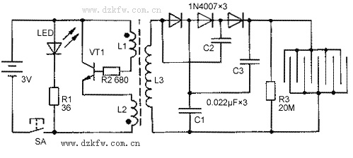 當(dāng)按下電源開關(guān)SA時,由三極管VT1和升壓變壓器T構(gòu)成的高頻振蕩器通電工作,把3V直流電變成18kHz左右的高頻交流電,經(jīng)T升壓到約500V,再經(jīng)三支1N4007二極管、電容器C1~C3組成的三倍壓整流電路升高到1500V左右,加到特制的金屬網(wǎng)上。當(dāng)蚊蠅觸及金屬網(wǎng)絲時,高壓就會通過蟲體放電,將蚊蟲擊斃。