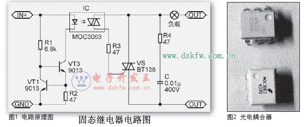 固態繼電器作為電子開關,其通斷無機械接觸部件,較普通電磁繼電器工作可靠、開關速度快、無噪聲與火化,加上控制電流小,能與一般的CMOS電路兼容。因此,在日常的電子制作與電子產品的開發中,多用固態繼電器代替普通的電磁繼電器。固態繼電器一般由輸入恒流控制部分、光電耦合器隔離部分及輸出功率開關部分組成。當然,在已知輸入電壓變化范圍不大時,我們可以將恒流部分省略掉。根據實際應用中負載供電電源是交流還是直流,在制作時可選用不同類型的光電耦合器及功率開關元件。在供電電源為直流時,光電耦合器可以選用4N系列(受光器件為光敏三極管),功率開關元件用晶體三極管或達林頓復合管;供電電源為交流時,光電耦合器可選用MOC306x系列(受光器件可看作光控的雙向觸發二極管),功率開關元件用單向晶閘管或雙向晶閘管。