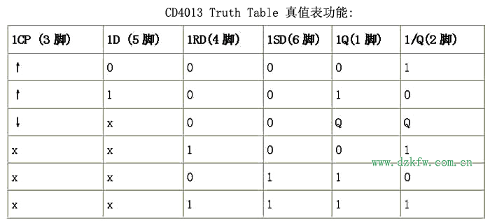 CD4013是一雙D觸發器,由兩個相同的、相互獨立的數據型觸發器構成。每個觸發器有獨立的數據、置位、復位、時鐘輸入和Q及Q輸出,此器件可用作移位寄存器,且通過將Q輸出連接到數據輸入,可用作計算器和觸發器。在時鐘上升沿觸發時,加在D輸入端的邏輯電平傳送到Q輸出端。置位和復位與時鐘無關,而分別由置位或復位線上的高電平完成。