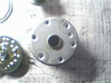4)我用原來裝在電機上的皮帶輪試了一下,正好可以放進拆掉含油軸承的地方,而且可以和外殼之間靈活旋轉(運氣不錯!大家也可以試試別的)。于是我在這個上面鉆了幾個小孔,把那三條漆包線從小孔里穿出來。從而可以用來保護漆包線在轉子和定子結合出的安全。(注意:替代上去的部分是和轉子保持固定,和外殼之間是可以旋轉的)。