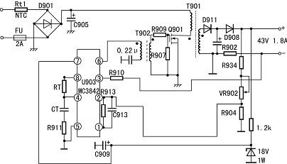 - 第2腳內部誤差放大器反相輸入端。充電器正常充電時,最高輸出電壓為43V。外電路由R934(16kΩ)、VR902(470Ω)、R904(1kΩ)分壓后,得到2.5V的取樣電壓,與誤差放大器同相輸入端的2.5V基準電壓比較,檢出差值,通過輸出脈沖占空比的控制使輸出電壓限定在43V。在調整此電壓時,可使充電器空載。調整VR902,可使正負輸出端電壓為43V。