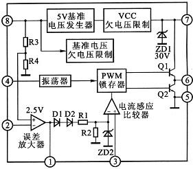 - 第8腳為5V基準電壓輸出端,同時在IC內部經R3、R4分壓為2.5V,作為誤差檢測基準電壓。