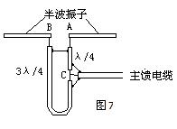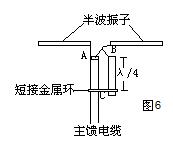 半波振子的一臂與主饋線外導體相連(圖6中的A點),另一臂與λ/4導體上端和同軸電纜的內導體相連接(圖6中的B點),λ/4導體的下端則通過短接金屬環與主饋線的外導體相接(圖6中的C點)。那么A--》B點之間的距離為λ/2,所以,B點的信號送到A點時剛好反相,這樣一來就把同軸線的不對稱變為對稱了。從A、B兩點向短接金屬環看進去是一段λ/4的短路線,其阻抗為無窮大,所以對阻抗匹配不會造成影響。