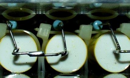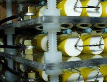 注意!電容之間不要緊密接觸!要留有一定空隙,層與層之間要用4mm厚的有機玻璃隔離,每層包含兩個鏈,固定使用塑料螺絲(一般都叫尼龍螺絲), 每層都有各自的接口使之成為獨立可使用的單元,如圖: