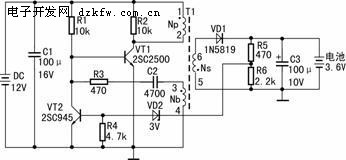 在VT1截止時,直流供電輸人電壓和Nb感應(yīng)的3負(fù)4正的電壓又經(jīng)R1、R3給C2反向充電,逐漸提高VT1基極電位,使其重新導(dǎo)通,再次翻轉(zhuǎn)達(dá)到飽和狀態(tài),電路就這樣重復(fù)振蕩下去。