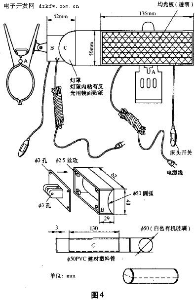 燈殼的加工尺寸示于圖4。A為塑料涼衣夾(超市有賣)。B為電源盒,用2mm~3mm厚的有機玻璃按圖4-B加工,完成后用“101”瞬間粘接劑與燈罩“C”膠接。C為燈罩,取一段中50mm、長130mm的PVC建材塑料管,兩端用銼刀銼平,再用2mm~3mm厚白色有機玻璃加工成兩塊直徑為50mm的圓片,用“101”膠水將上述兩塊圓片粘封在PVC塑料管兩端,待膠水干透后(一般需3小時~4小時),用銼刀修去“毛邊”,然后按圖4-C虛線所示用“細牙”鋼鋸縱向等分鋸開,再用砂皮磨平,這樣,一下子就做成兩只燈罩,再取用其中一只燈罩,在燈