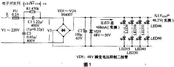 床頭小夾燈電原理圖如圖1所示。這是一種電容限流“降壓”整流源和負載超高亮發光二極管相結合的照明電路。它是利用電容c1在交流220V電路中所產生的阻抗(即容抗XC1)將交流電流限制或“鎖定”到負載LED所需電流值,再經VD1~VD4整流,C2濾波為LED1~LED60供電(注:圖1中VD5是瞬變電壓抑制二極管,目的是攔截≥48V電壓加到負載,確保LED安全運行,C3作用是濾除竄入電源頻率較高的脈沖雜波)。它的印制電路見圖2,LED燈板印制電路見圖3。