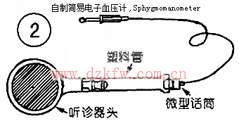 電子血壓計(jì)的調(diào)整基本和交流放大器調(diào)整相似。R4用以調(diào)節(jié)交流放大量,一定要注意和標(biāo)準(zhǔn)血壓計(jì)相配合,才能很容易地達(dá)到滿意的準(zhǔn)確度。壓電傳感器可用駐極式微形話筒和一個(gè)聽(tīng)診頭(如圖2所示裝配而成。使用時(shí),把繃帶纏在胳膊上,臺(tái)上壓力開(kāi)關(guān),手壓加壓氣球增加壓力,然后打開(kāi)壓力開(kāi)關(guān)逐漸減輕壓力,發(fā)光二極管第一次閃光時(shí)的讀數(shù)為血壓上限值(收縮壓),發(fā)光二極管最后一次閃光時(shí)讀數(shù)為血壓下限值(舒張壓)。