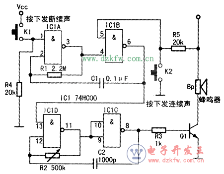 K1按下后,(13)腳高電平,IC1D、IC1C產(chǎn)生2Hz的方波,控制IC1D(13)腳,(13)腳為高電平時,IC1D、IC1C產(chǎn)生2kHz方波通過R3、Q1驅(qū)動蜂鳴器;當(13)腳為低電平時,IC1D、IC1C停振,⑧腳輸出低電平,Q1關斷。從而使蜂鳴器發(fā)出每秒2次的斷續(xù)嘀一嘀聲。IC1B⑤腳平時通過R5接高,正常工作,K2按下后,⑤腳為低,IC1A、IC1B停振。(13)腳=⑥腳恒高,蜂鳴器發(fā)出持續(xù)的嘀聲。