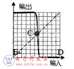 由于IC1③腳和④腳連按,其⑥腳輸出的信號與②腳同相但幅度放大。圖中C1起正反饋作用。只要②腳電壓有微小的波動,如提高0.1mV,則③腳電壓降低100mV,再經(jīng)IC1B反相,⑥腳輸出電壓升高大于1V,此電壓變化通過C1送回②腳,使②腳電壓繼續(xù)升高,直至VCC+0.7V。這時,IC1內(nèi)部的保護二極管導通,使輸入電壓不能高,反相器工作點停在右圖的D點。D點位于傳輸特性的水平線上,輸入變化幾乎不影響輸出。此時,IC1的②腳為高電平,③腳為低電平,⑥腳為高電平。電阻R1接在②、③腳之間。③腳是輸出端,內(nèi)阻很低,②腳是輸入端,內(nèi)阻極高。②高③低的電位差使得R1上的電流I的方向如左圖所示,放電的起始電壓為VCC+0.7V,放電的最終電壓為0V。
