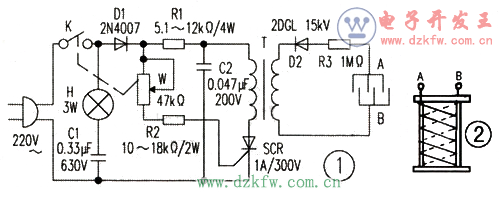 圖1電路接通電源后.電源正半周由二極管D1整流后,通過降壓限流電阻R1、R2和電位器W,分別向單向晶閘管SCR的陽(yáng)極與控制極提供正電壓。調(diào)整電位器W,使該通路電壓達(dá)到控制極的觸發(fā)電壓時(shí),單向晶閘管SCR便導(dǎo)通,電容C2通過脈沖變壓器T的初級(jí)線圈和單向晶閘管SCR放電,C2的容量越大,脈沖變壓器T的次級(jí)線圈感應(yīng)的電壓越高。當(dāng)電源電壓從正變到零時(shí),單向晶閘管SCR因流過的電流小于維持電流而關(guān)斷。之后,單向晶閘管SCR就承受電源的反向電壓。直到下一個(gè)周期觸發(fā)脈沖再次加到控制極上時(shí)重新導(dǎo)通。改變電位器W的值.就改變了導(dǎo)通角的大小。即能改變輸出電壓的高低。由于單向晶閘管SCR的頻繁導(dǎo)通和截止。形成高頻振蕩,在脈沖變壓器T的次級(jí)線圈上感應(yīng)出10000V到15000V的高壓.經(jīng)高壓硅堆D2整流,就在圓形電網(wǎng)上形成直流電擊高壓