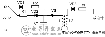 220V市電負半周經過R1、VD2對C1充電;正半周經過VD1、R2觸發可控硅導通,使C1通過可控硅經L1放電,從而在L2側感應出高壓。L2輸出的脈沖高壓經VD3整流得到萬伏左右的負高壓,經保護電阻R3后通過放電針對空氣放電,產生負離子。