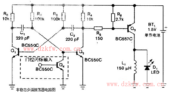 在電路元件選擇時.元件參數無特殊限制,其中的晶體管,使用任何小信號晶體管。但可能情況下,盡量為Q3選擇一個有高直流增益和低集射飽和電壓的PNP晶體管,以獲得最佳效率。另外,注意峰值電流不要使L1飽和,并且不會超過Q3和LED的最大額定峰值電流。非穩態電路可在低至0.6V電源下開始工作.但LED不發光.當電源電壓超過0.9V時發弱光。當電源電壓超過1V時.LED有充足的亮度,不過這要取決于LED的正向電壓。如果不需附圖電路中的LED閃爍,可不用Q4管。