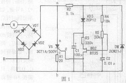 可控硅VS的觸發(fā)脈沖靠一只簡單的單結(jié)晶體管VS電路產(chǎn)生,電容器C2通過電阻R4、R5充電到穩(wěn)壓管DW的穩(wěn)定電壓UZ,當C2充電到單結(jié)晶體管的峰點電壓時,單結(jié)晶體管就觸發(fā),輸出脈沖而使可控硅導通。在單結(jié)晶體管發(fā)射極電壓充分衰減后,單結(jié)晶體管就斷開,VS一經(jīng)接通,那么a、b兩點之間的電壓就下降到穩(wěn)壓管DW的穩(wěn)定電壓UZ以下,電容器C2再充電就依賴于點a到b點間的電壓,因穩(wěn)壓管的電壓已經(jīng)降低到它的導通區(qū)域以外,點a到b點的電壓取決于電動機的電流、R1和VS導通時的電壓降。這樣,當VS 導通時,電容器C2的充電電流取決于電動機的電流,在這種情況下便得到了反饋,這就使得電動機在低速時轉(zhuǎn)矩所受損失的問題得到補救。